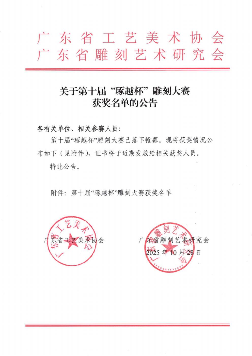 关于第十届“琢越杯”雕刻大赛获奖名单的公告