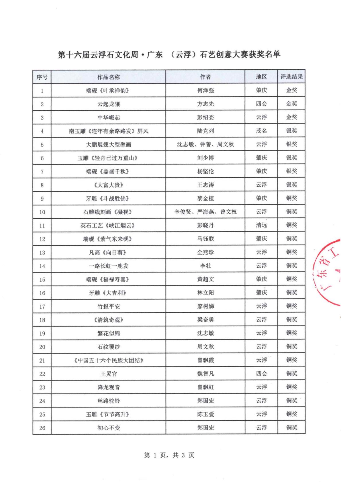 关于第十六届云浮石文化周·广东 (云浮)石艺创意大赛获奖名单的公告